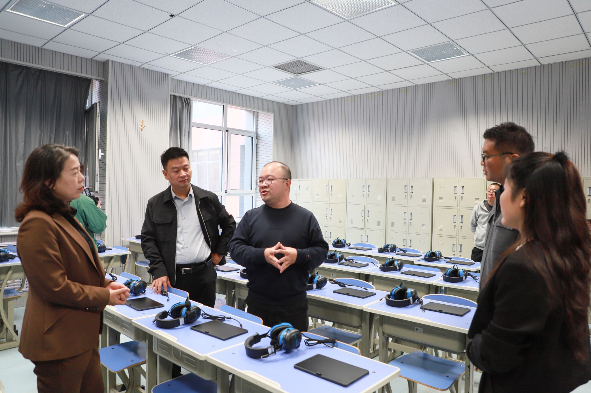 仪式结束后,与会嘉宾合影留念,并共同参观了外语听说训练教室,实地考察智能设备的应用效果。