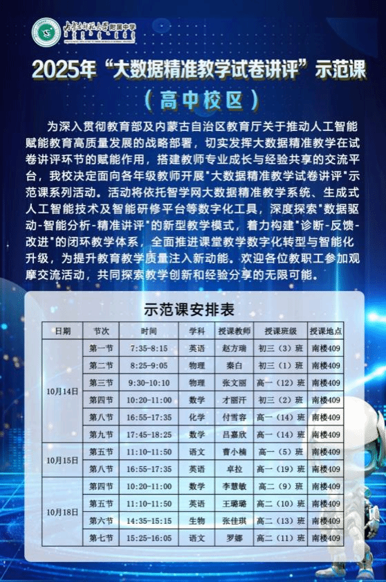 为深入贯彻教育部及内蒙古自治区教育厅关于推动人工智能赋能教育高质量发展的战略部署,切实发挥大数据精准教学在试卷讲评环节的赋能作用,搭建教师专业成长与经验共享的交流平台,内蒙古师大附中近期分别在高中校区和初中校区开展“大数据精准教学试卷讲评”示范课系列活动,以数字化工具为依托,探索新型教学模式,助力课堂教学数字化转型与智能化升级。