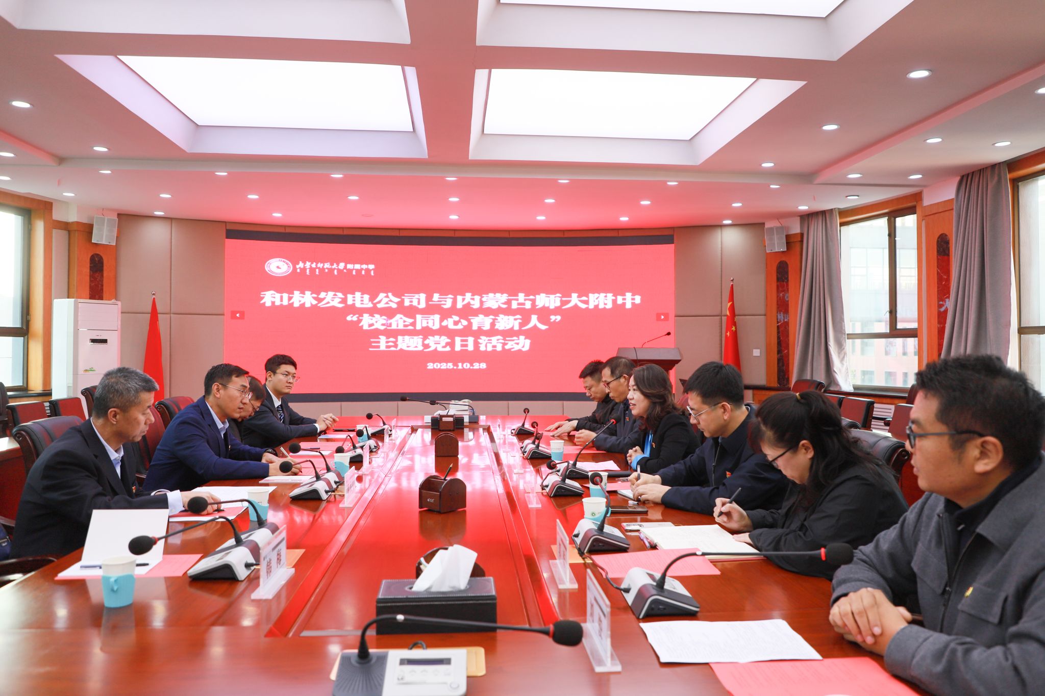 座谈交流环节,双方围绕“党建引领强根基、资源共享促发展、人才共育筑未来”核心议题深入研讨。和林发电公司分享了企业在绿色能源转型、科技创新攻关中的实践成果与责任担当;我校则介绍了学校在青年思想引领、特色课程建设、综合素质培养等方面的探索经验。观点交融间碰撞出合作火花,双方达成初步共识,未来将在科普讲座进校园、职业规划指导等领域深化协作,构建“党建+教育+产业”的融合育人新范式。