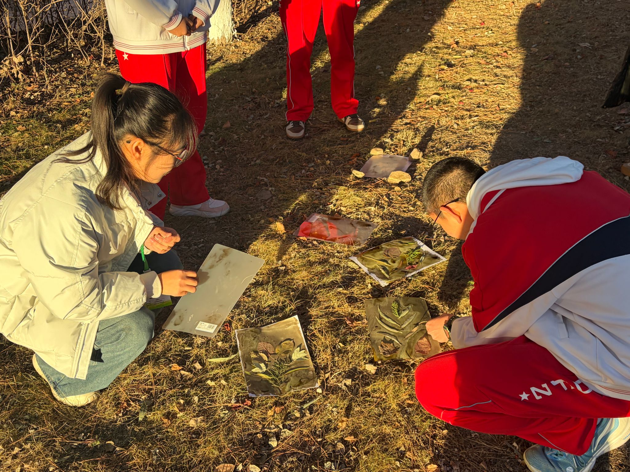 抱着卡纸冲向花园!大学生和中学生蹲在草坪边挑叶子:枫叶的脉络、三叶草的圆边、松针的细纹……“这个银杏叶像小扇子,晒出来肯定好看!”“我捡的梧桐叶够大,能盖满整张纸!”选好的草木朝下贴在感光卡纸上,用书皮压紧、夹子固定,像藏起一份阳光的约定。
