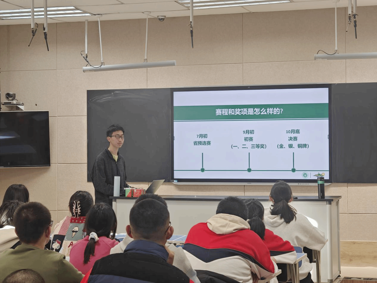 随后,朱国骏带来“竞赛:选择与方法”的主题分享,从“竞赛准备”“竞赛学法”“竞赛内容”三个维度,送上干货满满的备赛锦囊。他详细梳理了竞赛关键时间节点、适配人群特征,帮同学们厘清“是否适合走竞赛路”的困惑;结合自身备赛经历,分享了如何平衡高考学习与竞赛备考、如何深耕重难点知识、如何高效利用错题本等实用技巧;明确了竞赛核心知识范围,推荐了优质资料与线上学习资源,并现场解答疑惑。