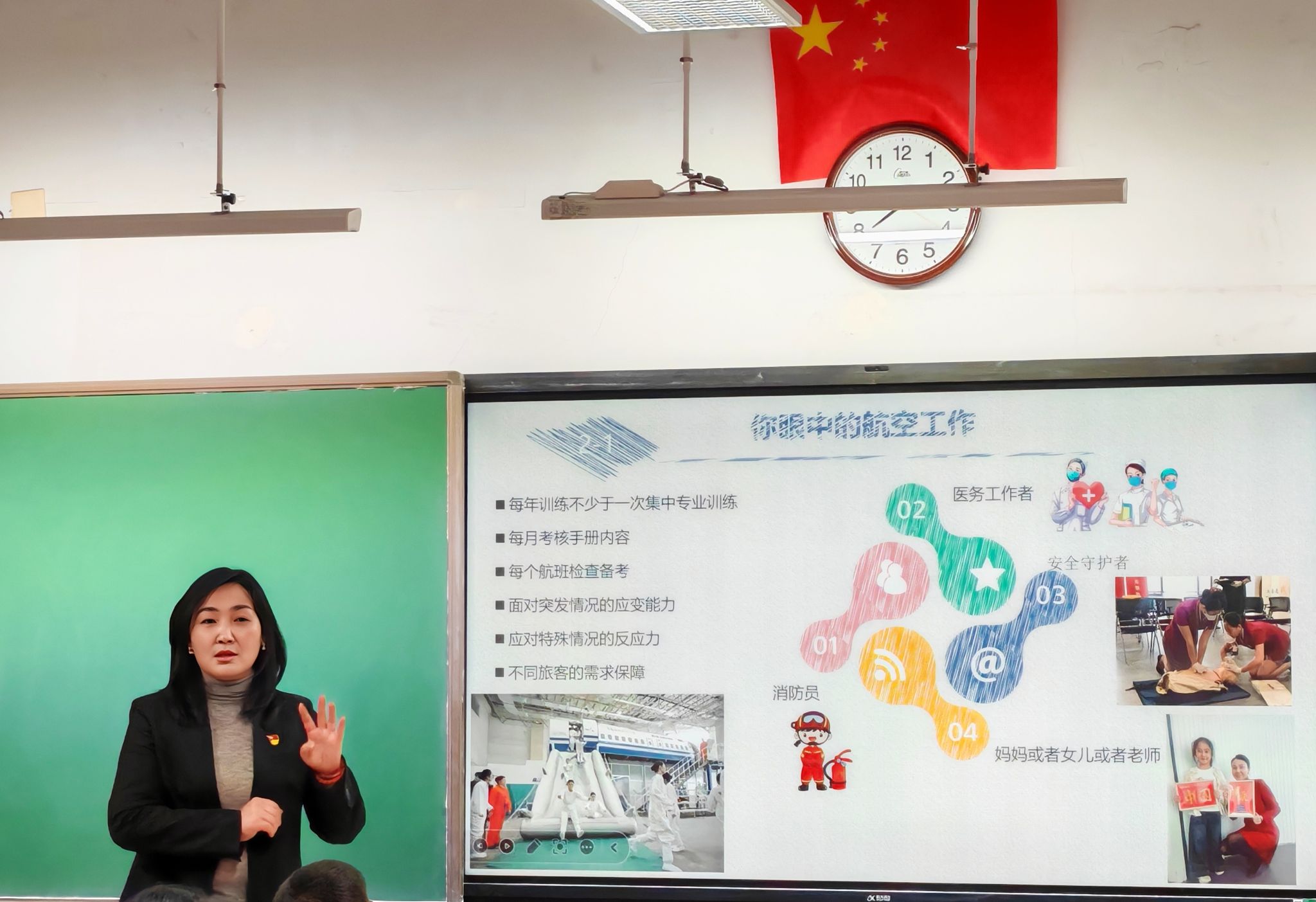 在互动时间,同学们好奇提问:“飞机上为什么必须关闭电子设备”,“如何成为一名飞行员”……针对这些问题,家长以专业而不失生动的语言一一作答,在普及航空知识的同时,更传递出精益求精、追求卓越的职业态度。分享临近尾声,家长寄语同学们要珍惜青春、扎实学习,将个人成长融入国家发展的时代浪潮,用知识与才干贡献社会、报效祖国。