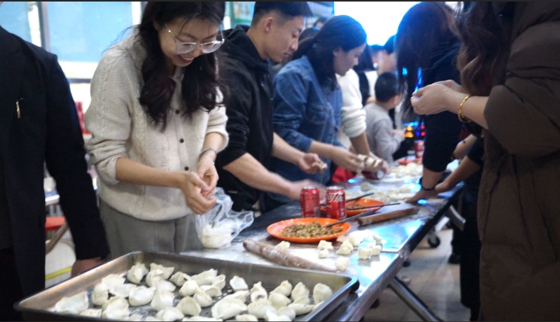 包饺子环节率先点燃大家的热情。各小组教职工围站在桌前,分工协作、各显身手。揉面擀皮的动作娴熟利落,填馅捏褶的手法各有千秋,不一会儿,一排排形态各异的饺子就摆满了托盘。大家一边忙碌,一边唠着家常,食堂里满是烟火气与欢笑声,尽显附中大家庭的温馨和睦。