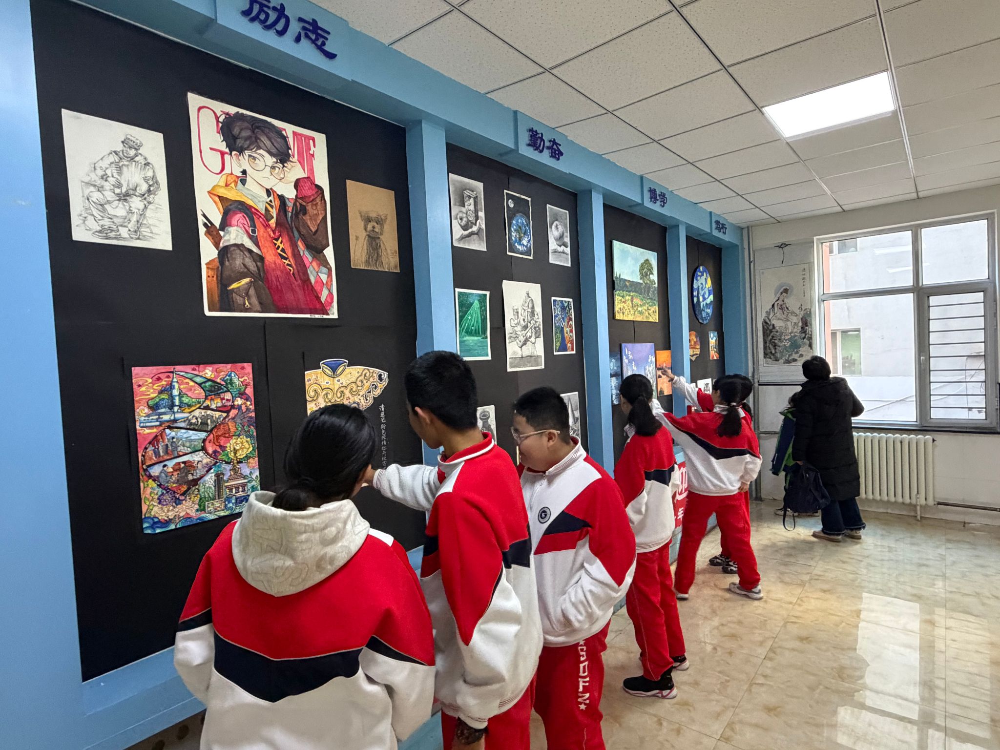 本次校园美术作品展以新年为灵感原点,征集作品涵盖国画、油画、素描、水彩等多个门类。同学们以笔为媒,将对新春的期盼、对校园的热爱、对家乡风土人情的眷恋凝于画纸:大气磅礴的山水国画勾勒出家乡文化的厚重底蕴,细腻生动的素描刻画着师生迎新的喜悦笑颜。楼道内,一幅幅作品错落有致,引得师生驻足流连,不时低声赞叹,在艺术熏陶中感受新年将至的温馨氛围。