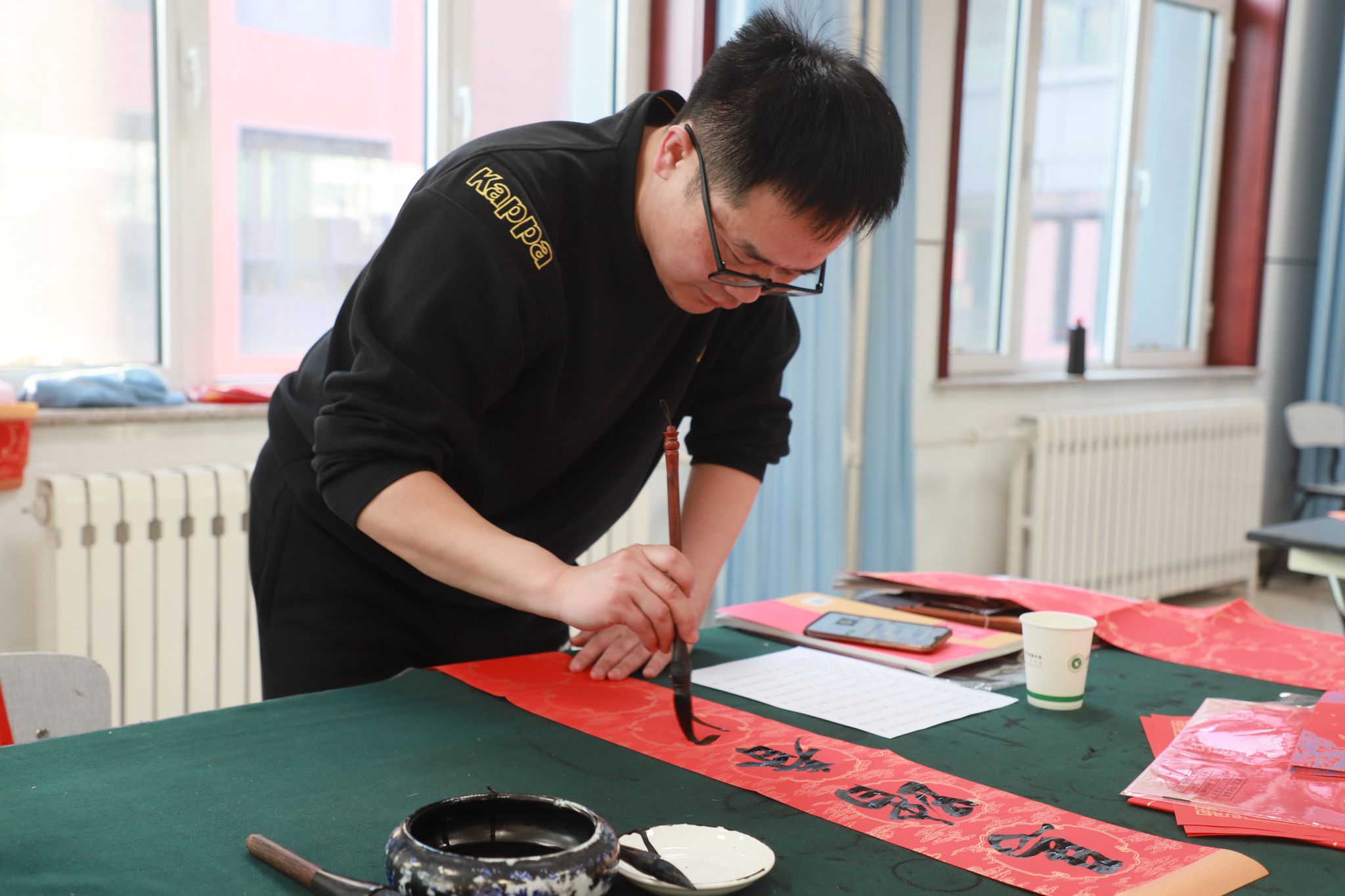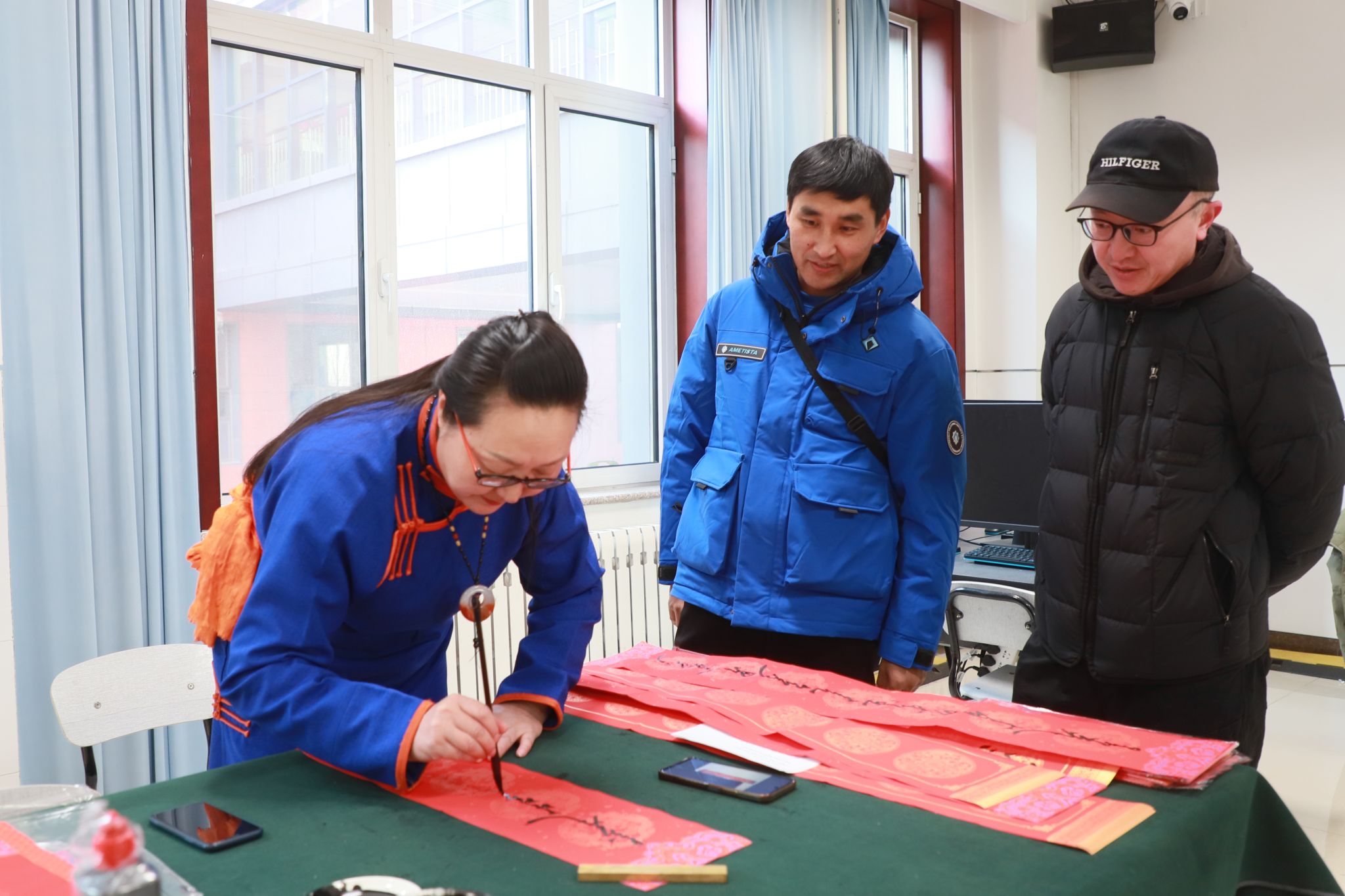 本次活动以“翰墨传情迎新岁,蒙汉同心启华章”为主题, 特别邀请了内蒙古自治区著名书法家和校内书法爱好者现场挥毫泼墨。书法家们全神贯注、落笔如龙,用蒙、汉两种文字精心书写春联与福字。笔墨之间,饱含着新春纳福的美好期盼。一幅幅作品既展现了传统书法的典雅韵味,又洋溢着新时代的蓬勃气息,一撇一捺尽显深厚文化底蕴,一字一句传递着浓浓的新春暖意。