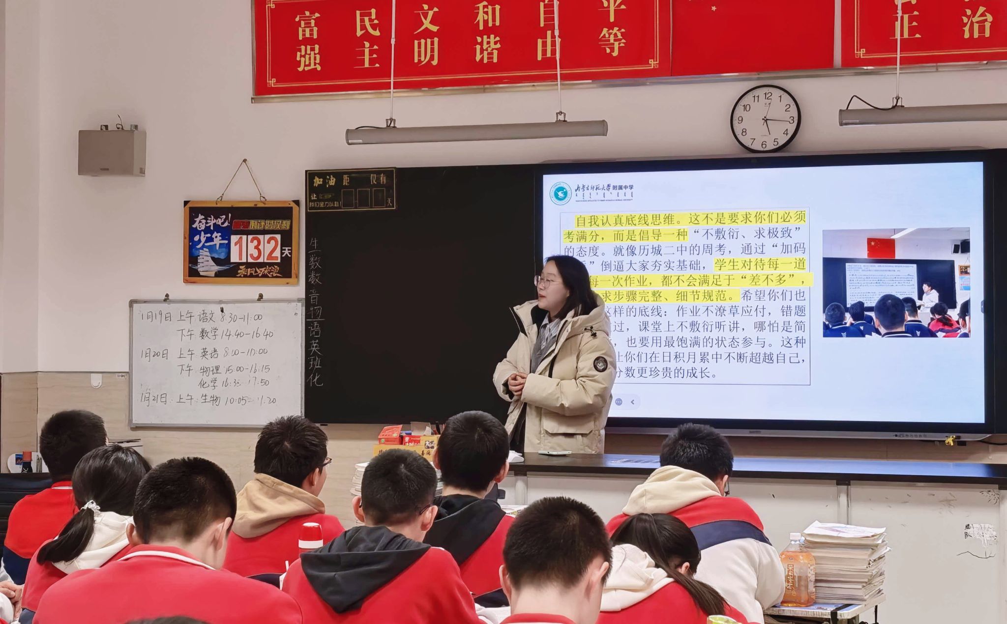 同学们在分享中提到:自律,让每一分钟都掷地有声;借鉴历城二中“以考促学”的备考策略,主动夯实基础、突破难点,不放过任何一个疑问,在错题复盘与精准补漏中稳步提升;合理规划学习时间,让专注成为常态,让钻研贯穿日常。最后,教师总结:于专注与认真之中,遇到更加出色的自己。