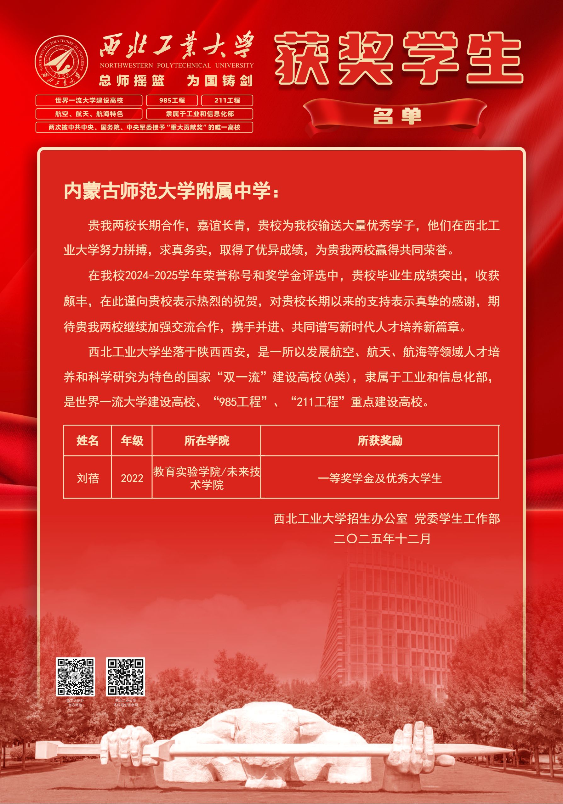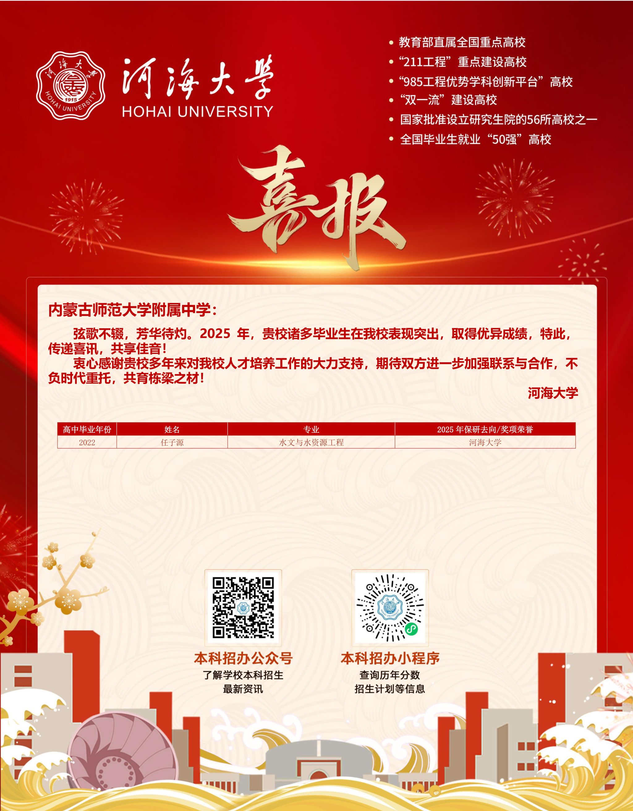 近期,西安交通大学、南京大学、西北工业大学、河海大学、陆军工程大学等国内知名高校相继发来喜报,我校多名毕业生因大学期间表现优异斩获各类荣誉,彰显了学校扎实的育人成效。
