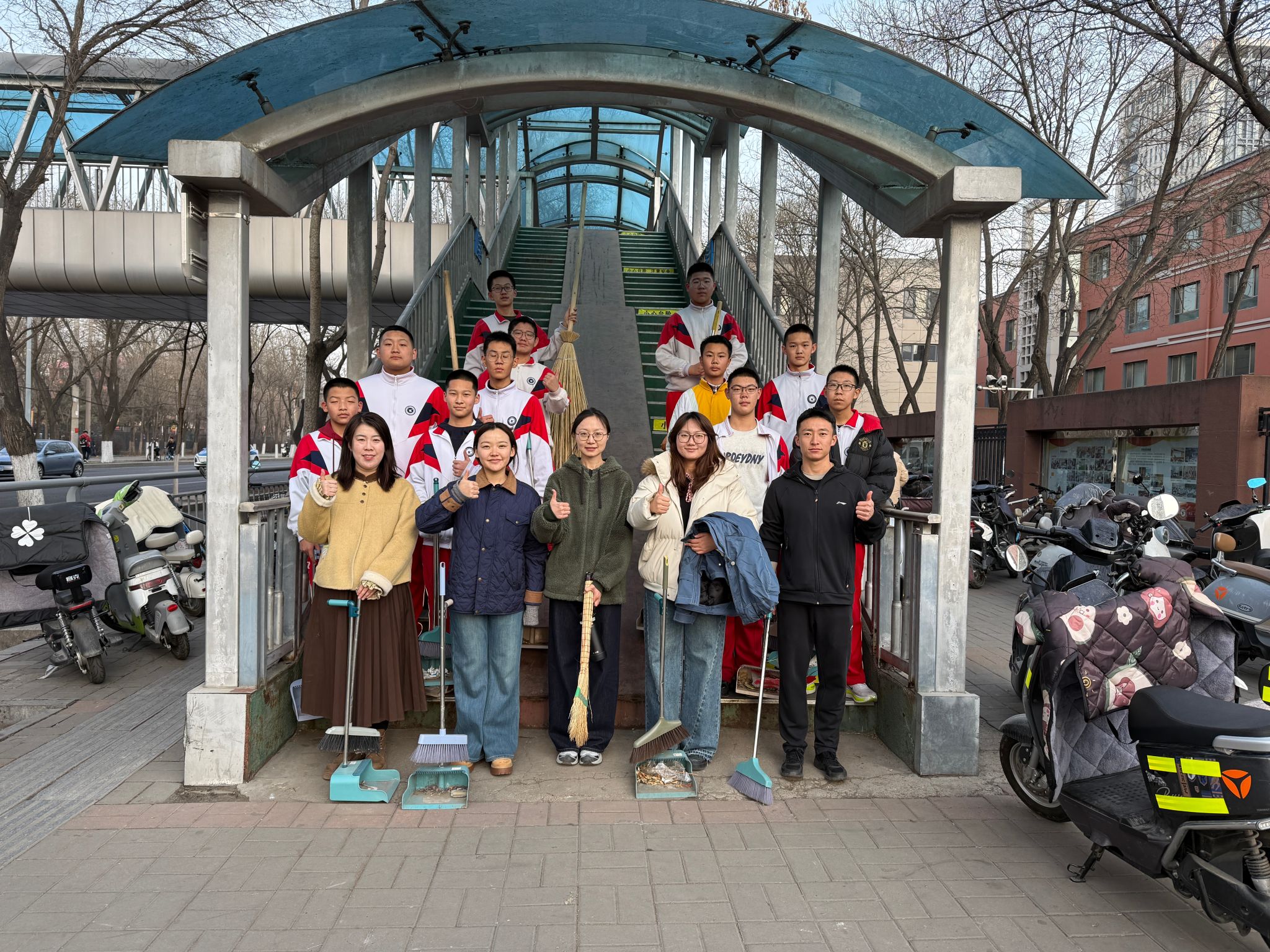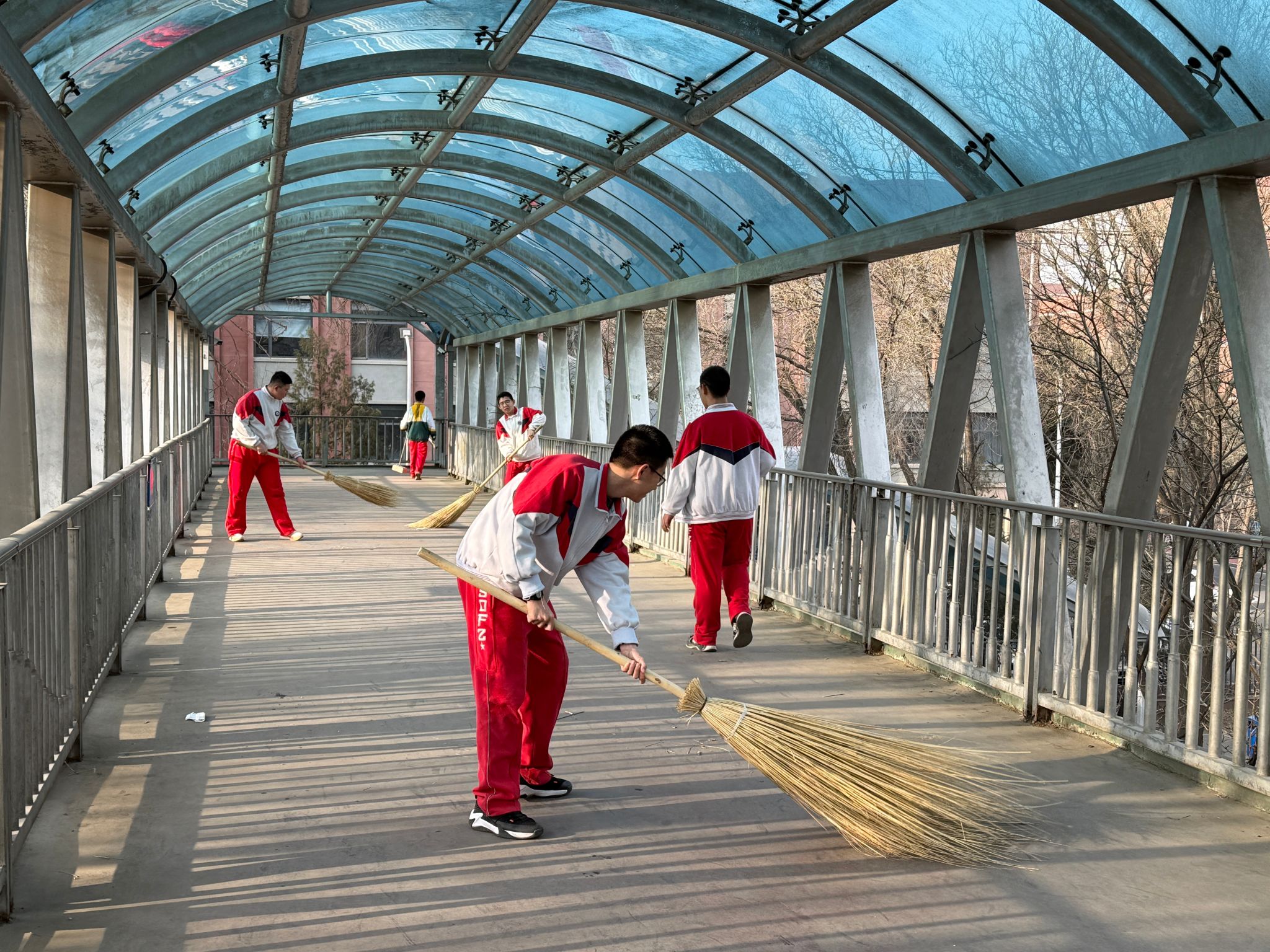 大家将杂乱停放的自行车逐一扶正、归位、对齐,让停车区域整齐有序、通行顺畅。在北门外的天桥上,同学们认真清扫台阶与路面,捡拾纸屑、杂物,清理卫生死角,不放过一处细节。弯腰、擦拭、摆放、清运,一个个忙碌的身影,成为春日里最温暖的风景。