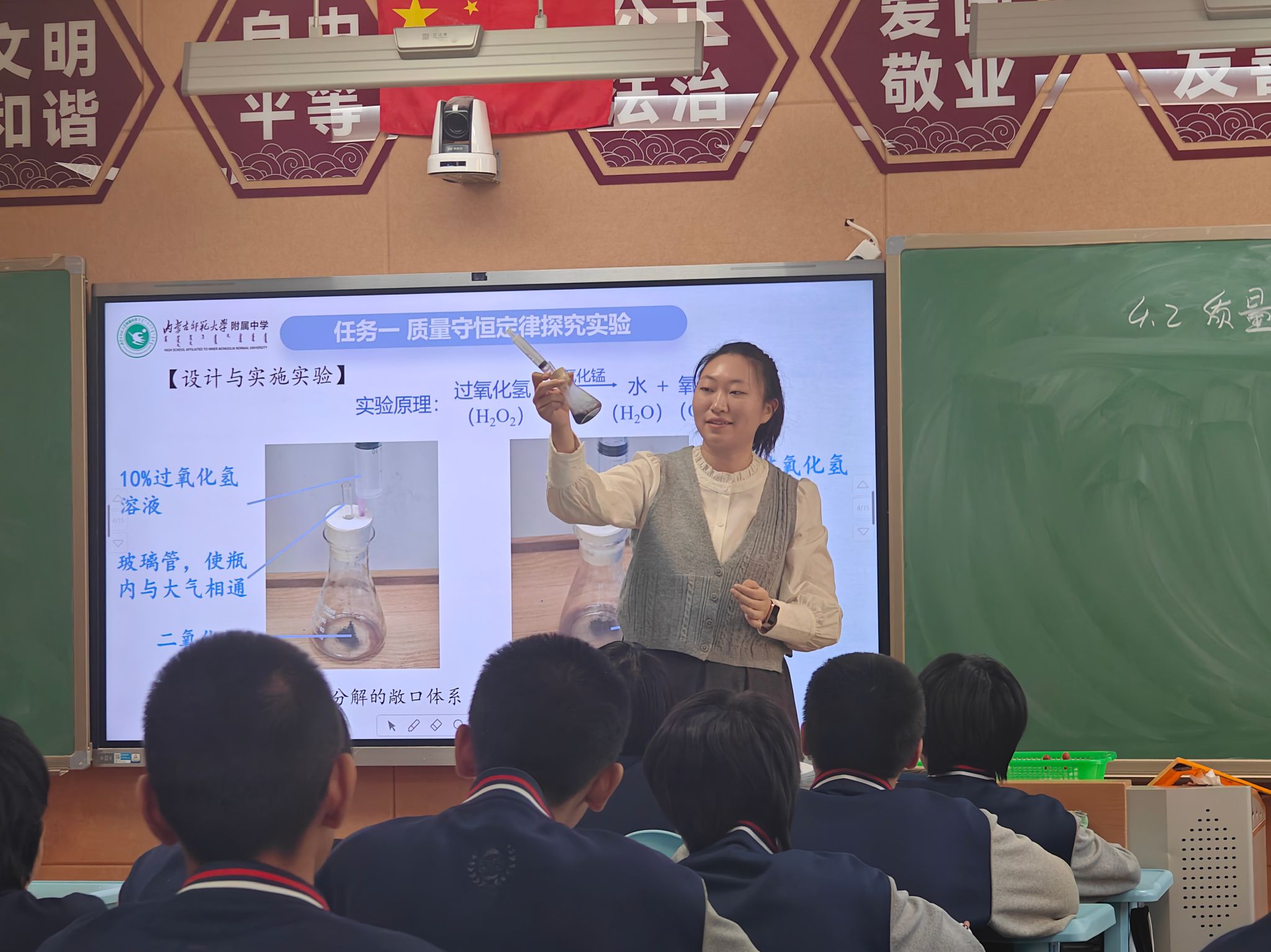 活动前期,我校化学教研组长王志丹与初三化学备课组进行集体磨课。我校教师张语书与实验中学教师张俊霞围绕“质量守恒定律”授课及说课。两位教师均以问题链驱动教学,尝试通过思维进阶达成教学目标,教学设计各有亮点。