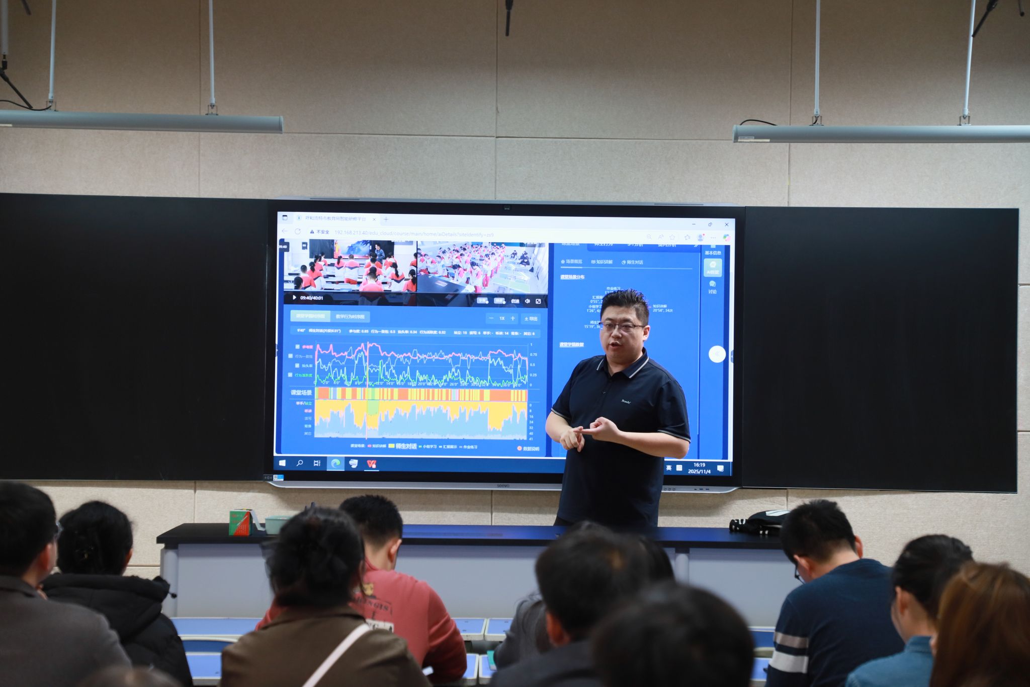 会上,凌之浩以“AI智能研修课堂数据应用”为核心主题,围绕教学时序图等关键维度展开深入讲解。他结合实际教学场景,深入浅出解析数据背后的教学逻辑,细致指导数据采集、分析与应用的实操方法,为我校教师规模化、常态化和精准化运用智能研修平台提供了清晰可行的实践路径。