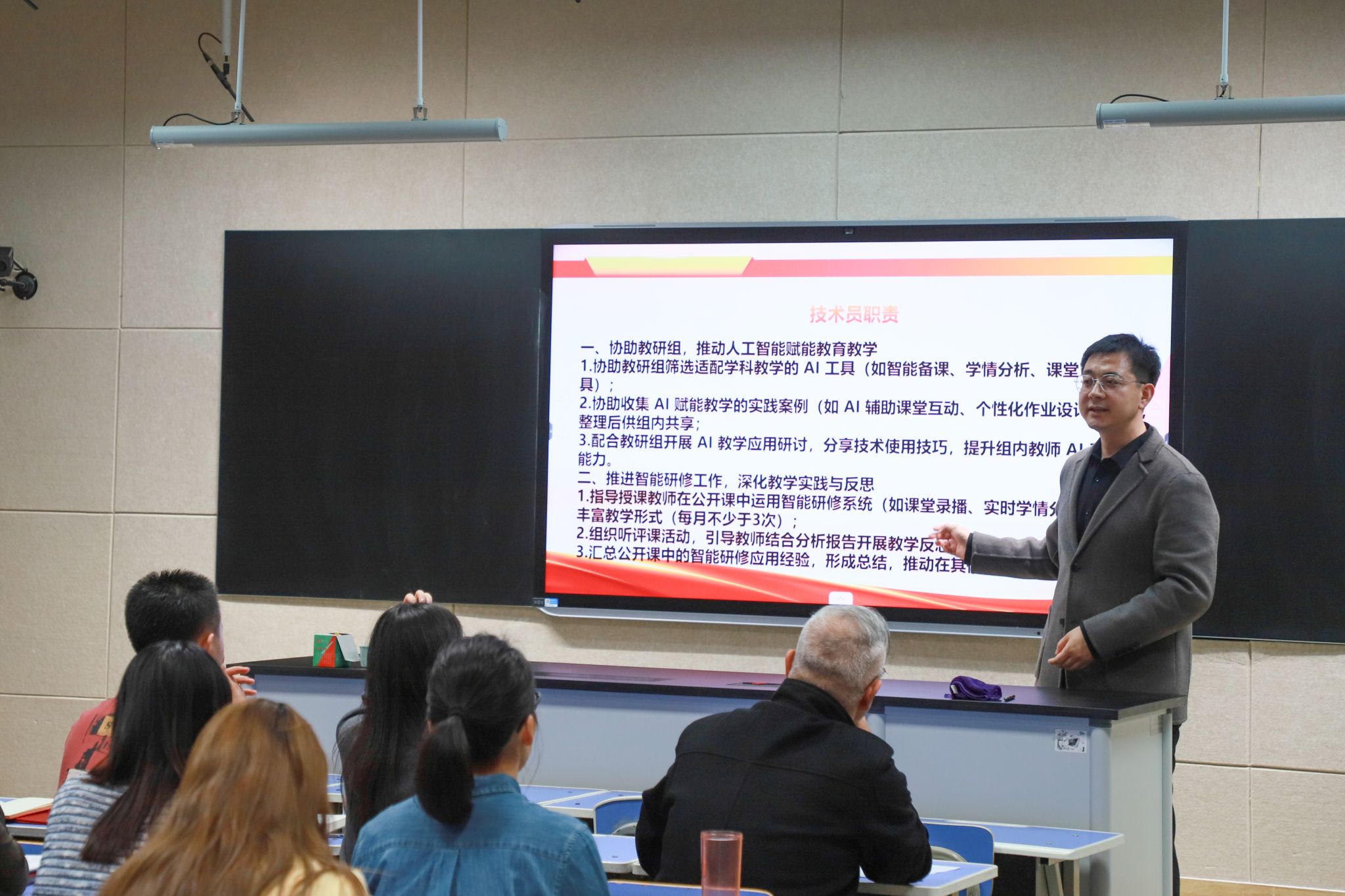 会议为我校各学科技术员颁发聘书,并明确学科技术员在平台推广、案例打磨、同伴互助等方面的职责,为后续工作开展划定重点、理清实施路径。会议进一步肯定了我校前期智能研修工作取得的阶段性成效,随后围绕“深化智能融合、提升教研质效”提出要求:希望学科技术员发挥示范引领作用,以点带面推动全校教师数字素养提升;希望各学科以智能研修为抓手,探索精准教学新模式,切实将技术优势转化为教学质量提升的实际成果。