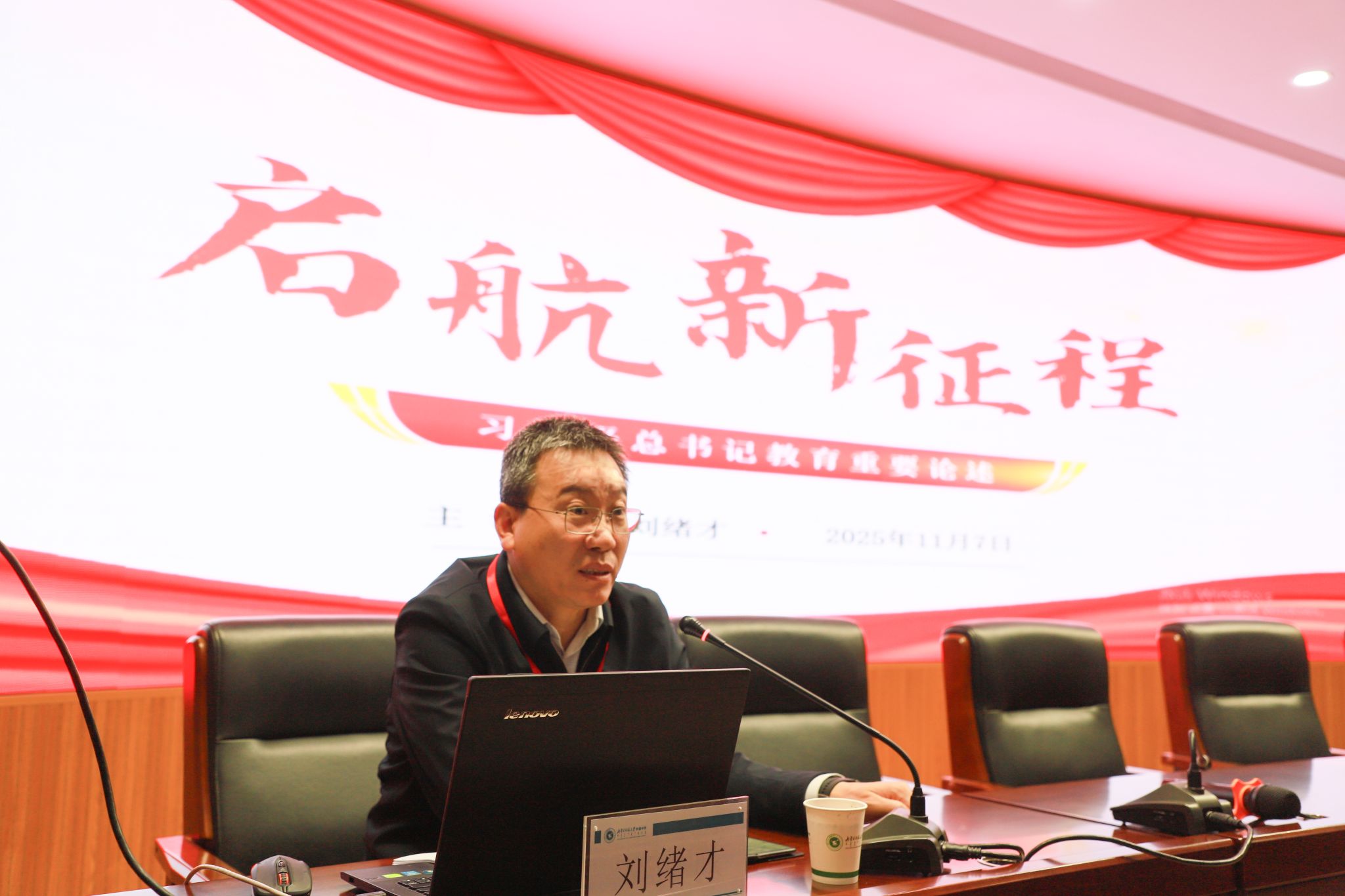 11月7日,我校校长刘绪才解读习近平总书记关于教育的重要论述时,号召教师以“立德树人”为根本,做学生成长的引路人,他强调教师要牢记为党育人、为国育才的初心使命,坚持不懈用习近平新时代中国特色社会主义思想铸魂育人。下午,著名学者李淑章教授做专题讲座,李教授以渊博学识溯源文脉,旁征博引解析文化精髓,字字珠玑间尽显大家风范。