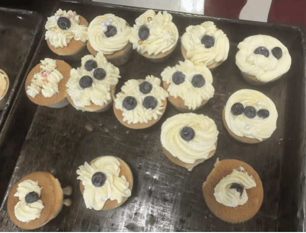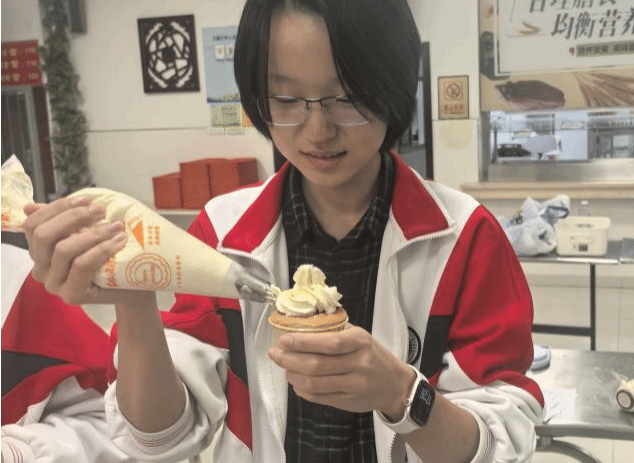 烤箱里的蛋糕慢慢膨胀、香气四溢,课堂里满是欢声笑语。冷却后,同学们化身“创意设计师”,用奶油挤花、水果点缀,一个个颜值爆表、香甜可口的纸杯蛋糕新鲜出炉,成就感直接拉满!