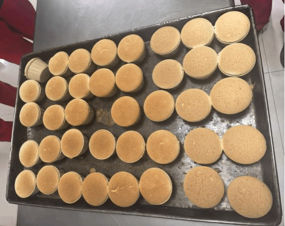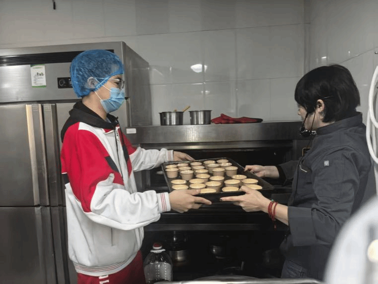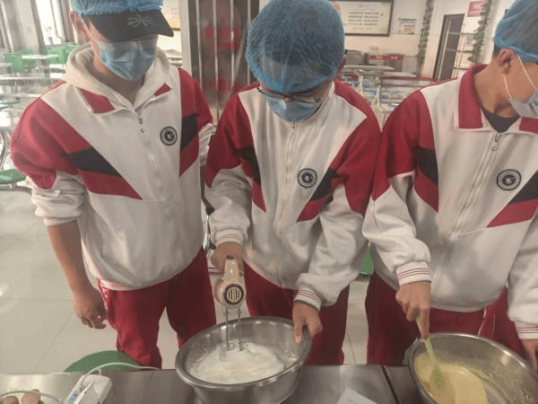 自主探究环节刚结束,同学们就迫不及待开启了蛋糕制作“实操模式”!称量面粉、分离蛋清蛋黄、打发蛋白霜、搅拌面糊、入模烘烤,每一个步骤都有条不紊。“搅拌不能画圈,不然面糊会起筋!”“糖分三次加进蛋清,打发到直立小尖角才够稳定。”大家互相提醒技巧,分工协作、默契十足。
