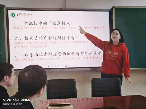 12月17日,语文教研组潘雨婷老师分享平台助力教研路径。组内构建“四有维度”观察体系,通过S-T曲线优化师生对话设计,守护学科人文底色。