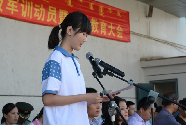 接着,高二(4)班朝鲁古日同学代表老生发言。他结合自身经历谈了军训的意义,希望学弟学妹们能克服困难完成好军训任务。高一(21)班王鸿娇代表参训学生发言,她在发言中有对参加军训的兴奋期待的情感抒发、有对高质量完成军训任务的信心宣告、有保证纪律严明顽强拼搏坚持到底的誓言,更有“军训将是高中生活的一段美好记忆”的温馨祝福。