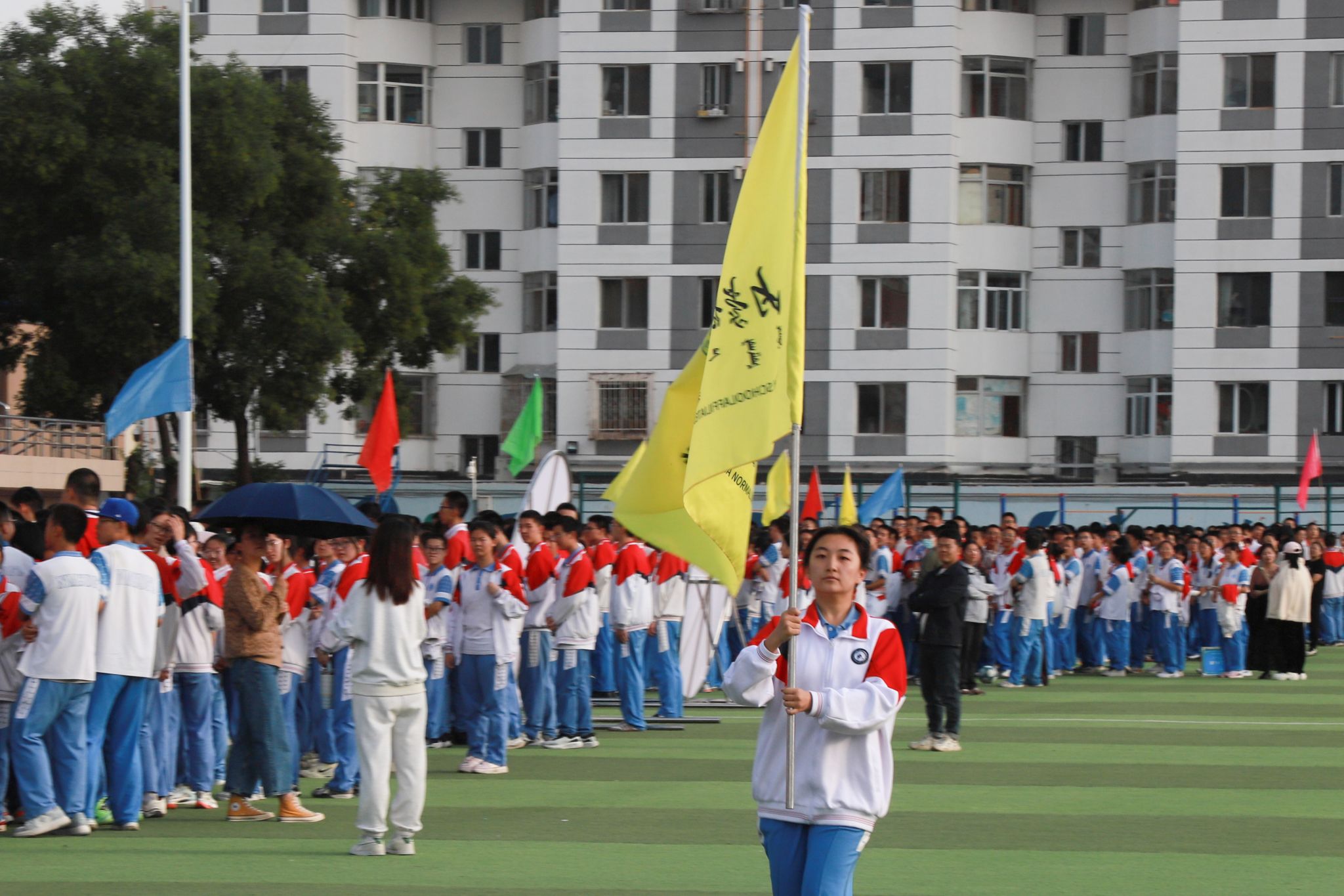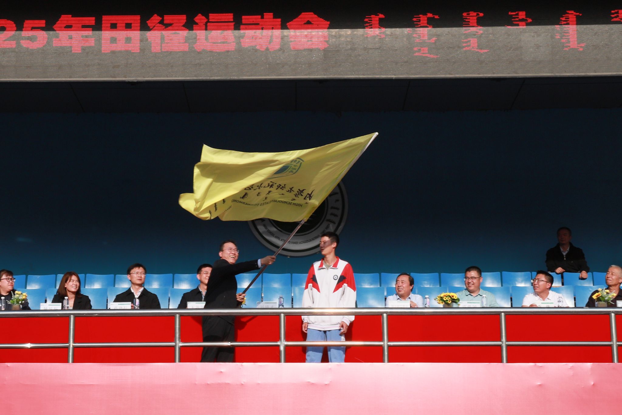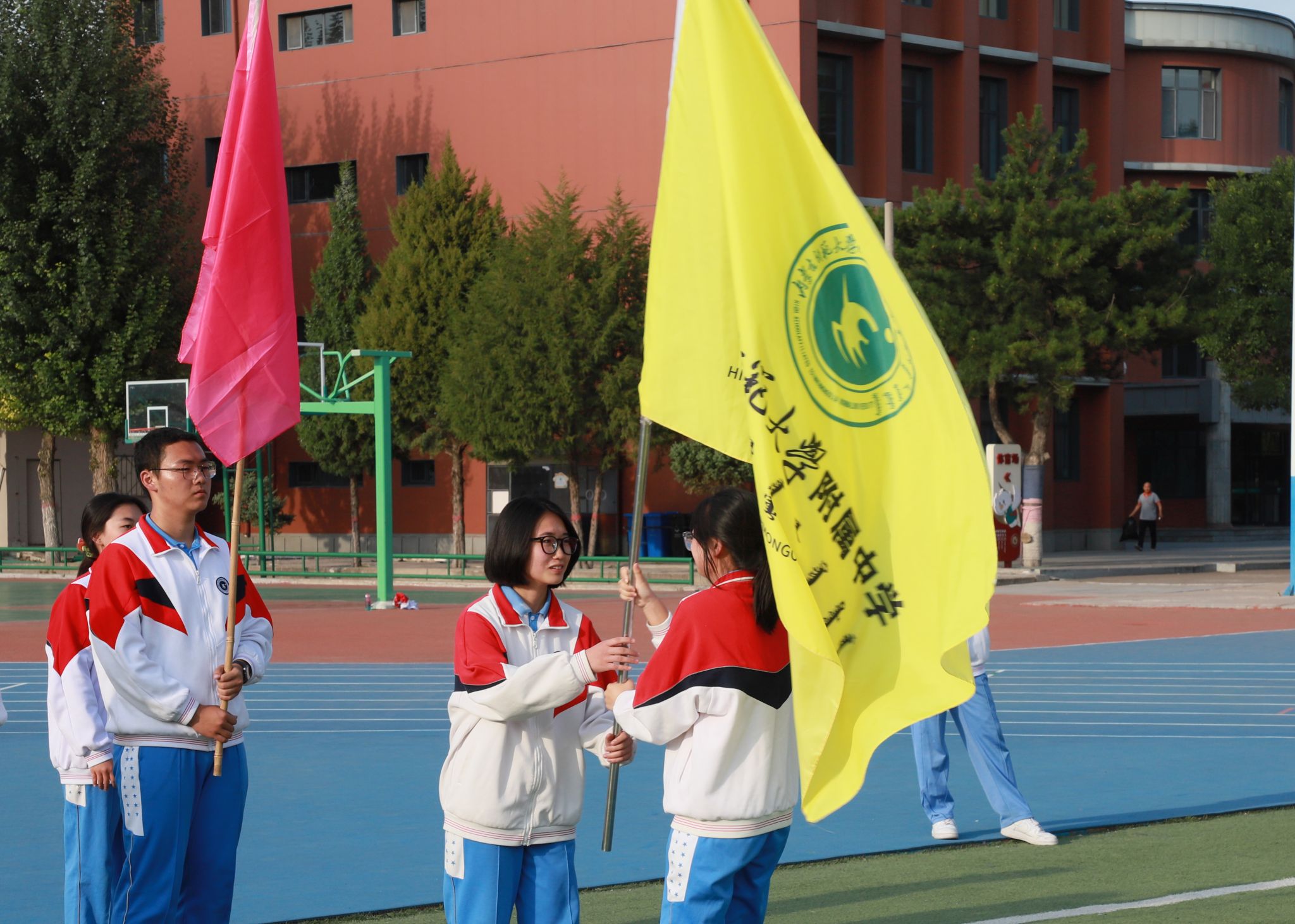 校旗传递仪式上,校领导将象征附中精神的校旗郑重授予运动员代表并致开幕词,寓意着体育精神的传承与发扬。