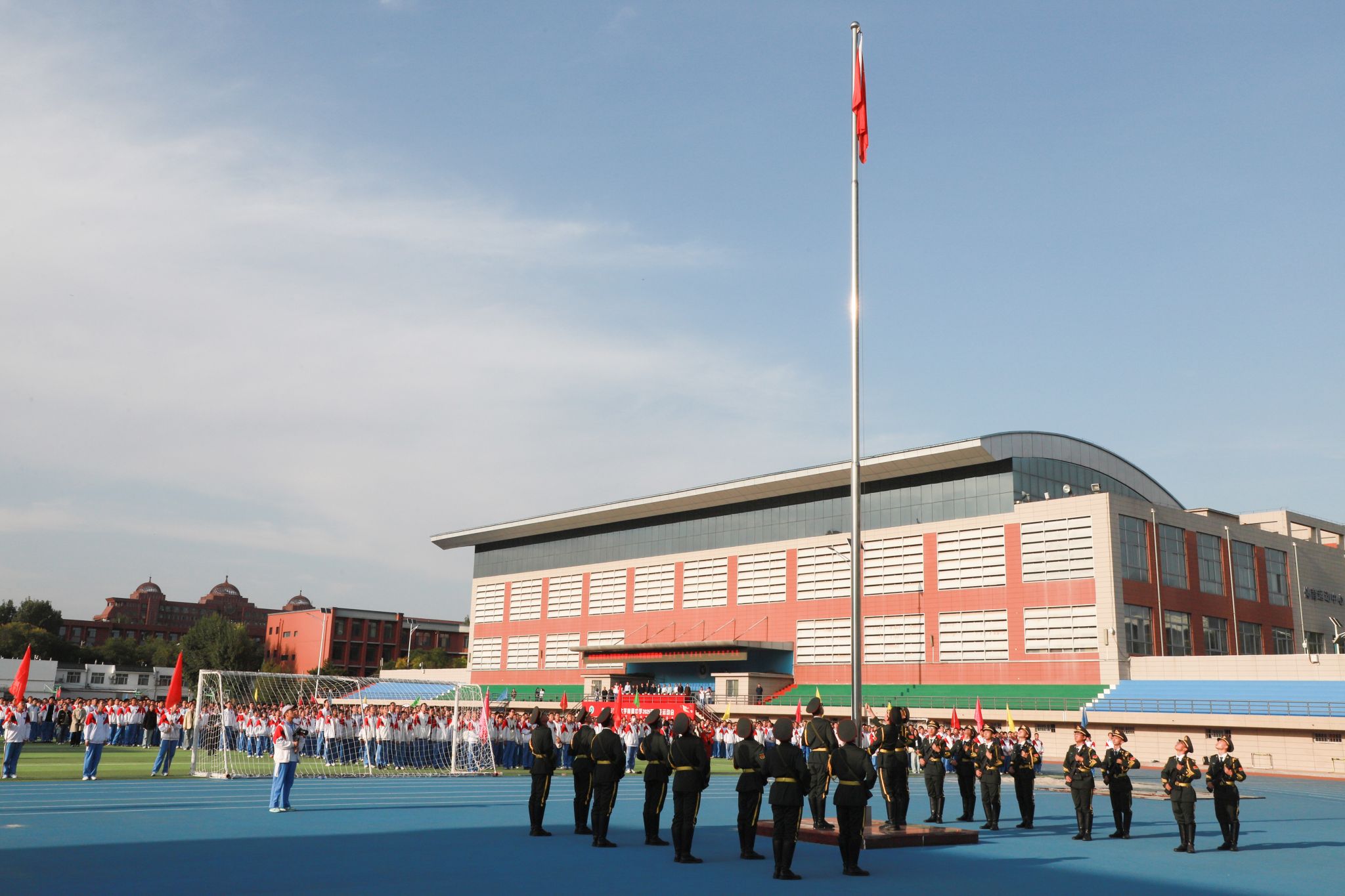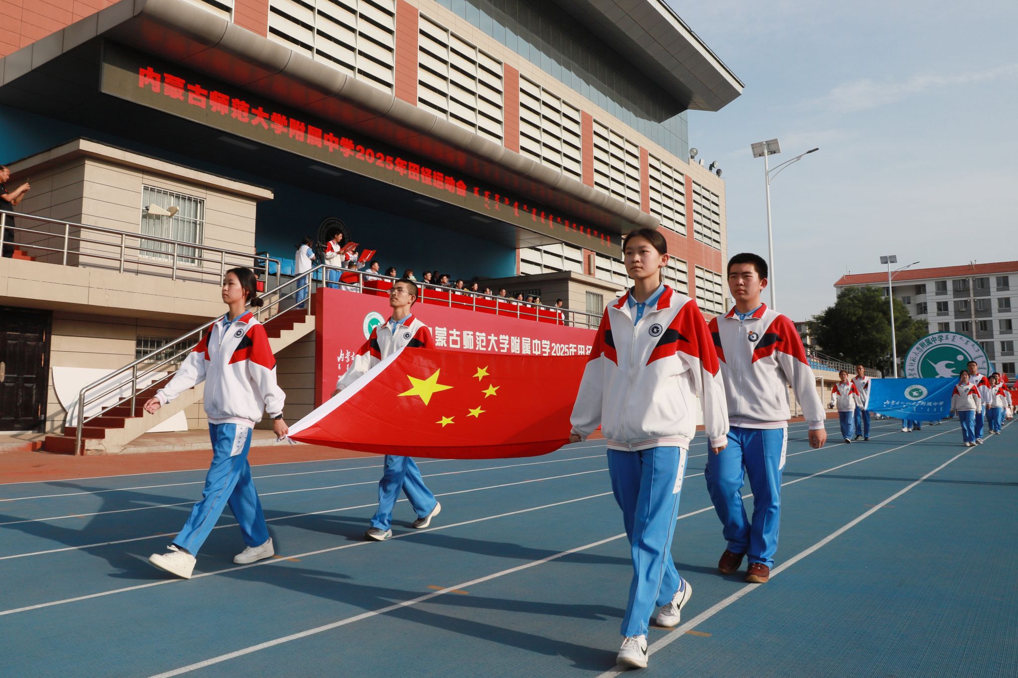在激昂的运动员进行曲中,国旗队、校旗队、民族服饰队、彩旗方阵等依次入场,同学们步伐铿锵、精神抖擞,展现附中学子蓬勃风貌。随后,在庄严国歌声中,五星红旗升起,全场师生肃立注目,开幕式由此拉开序幕。