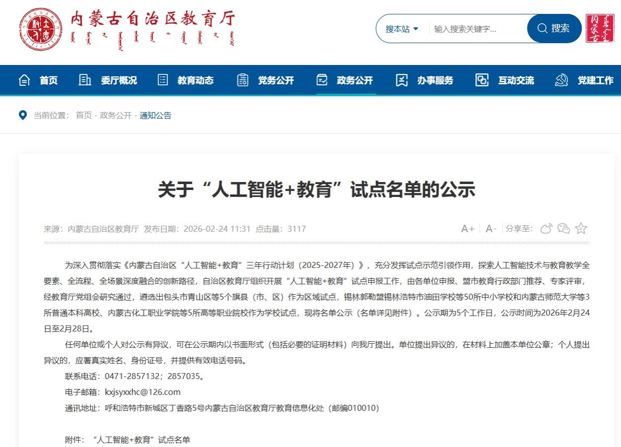 本次试点工作是深入贯彻落实《内蒙古自治区“人工智能+教育”三年行动计划(2025—2027年)》的重要举措,旨在充分发挥试点示范引领作用,探索人工智能技术与教育教学全要素、全流程、全场景深度融合的创新路径。