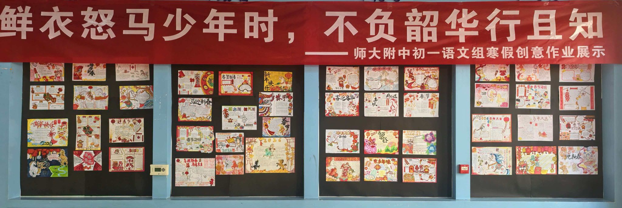 经语文组全体教师严格评审,从内容深度、版面设计、书写规范、创意表达四个维度进行综合考量,在数百份用心之作中评选出“年味创意达人”若干名。所有获奖作品在校园文化长廊集中展出,众多师生驻足观赏。