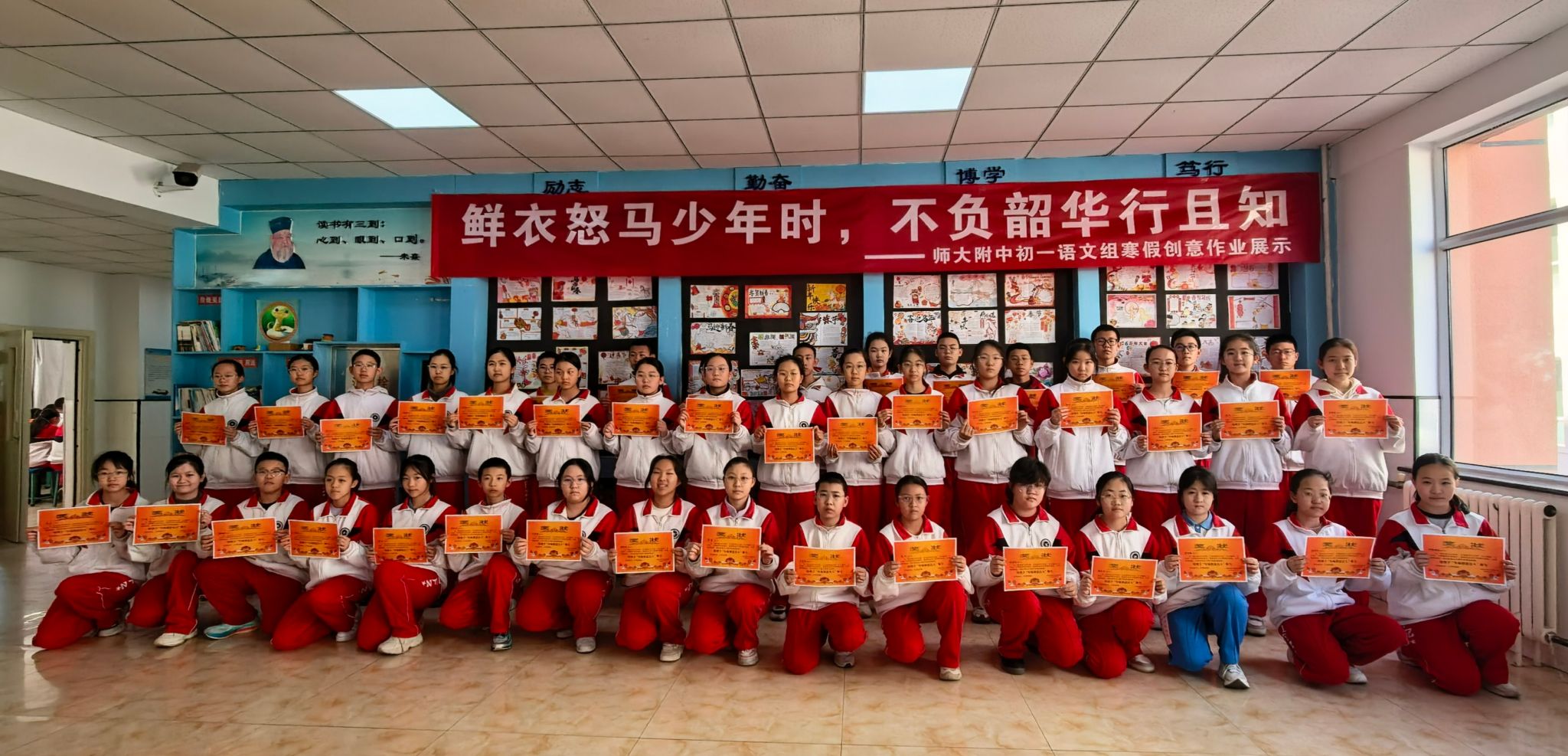 为深入贯彻落实“双减”政策,弘扬中华优秀传统文化,我校初一语文组举办“鲜衣怒马少年时,不负韶华行且知”寒假创意作业展示暨颁奖活动。