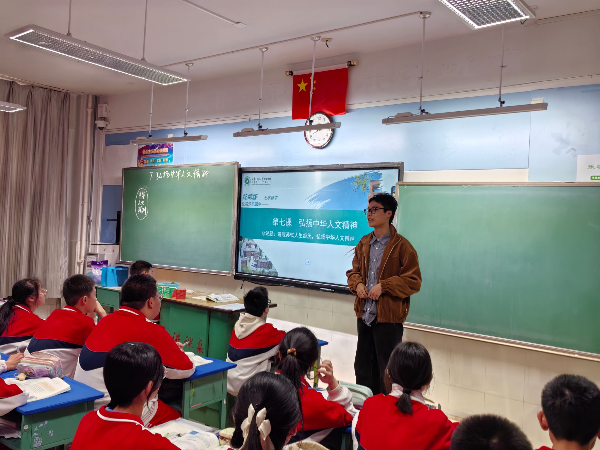 4月24日,内蒙古师大附中教师第四党支部以“党建引领、教研赋能”为宗旨,成功举办了支部党员示范课系列活动第三场。初一年级道德与法治教师蔺昱同以“苏轼的人生经历”为鲜活案例,为同学们带来了一堂以“弘扬中华人文精神”为主题的思政示范课,本课设计聚焦四大核心精神,通过沉浸式思政课堂设计,深化学生对中华优秀传统文化的理解,为落实立德树人根本任务注入了新动能。