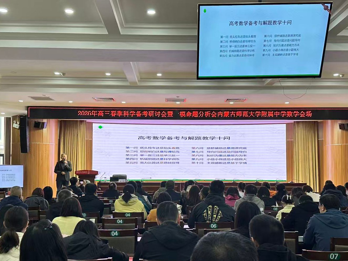 3月28日,由呼和浩特市教育教学研究中心主办的全市2026年高三春季科学备考研讨会暨一模命题分析会顺利举行。我校承担数学、生物学、物理、蒙古语文四个学科分会场的组织工作。活动特邀多位学科专家作专题报告,我校多名教师登台展示交流。