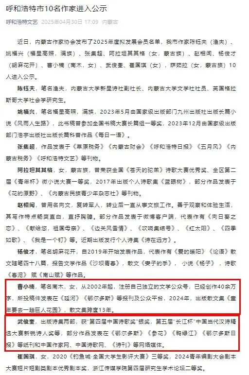 近日,内蒙古作家协会和呼和浩特市文联相继公布了2025年度内蒙古作家协会发展会员名单,我校教师武俊奎、曹小楠名字在列。学校表示热烈祝贺。